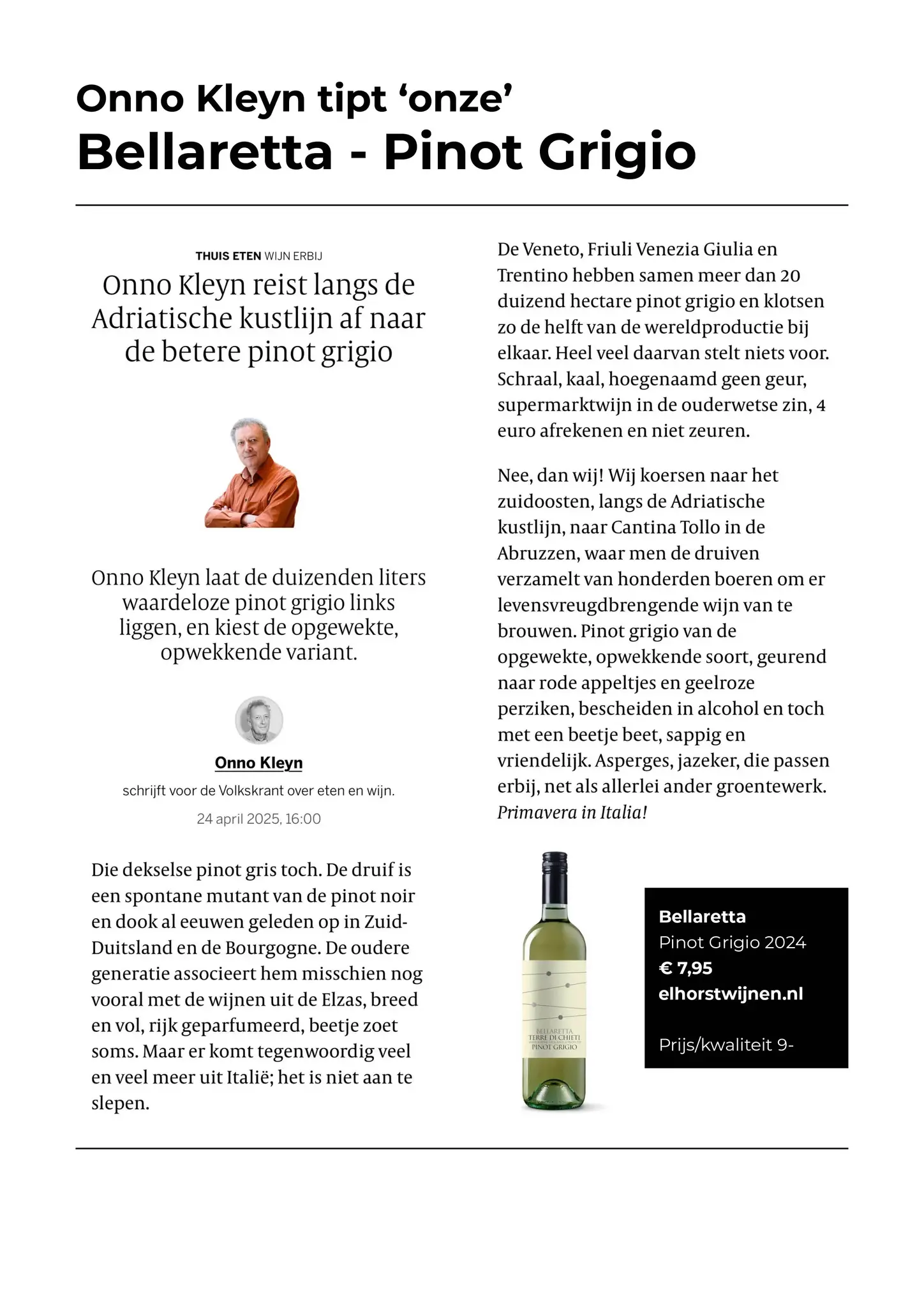 In de Volkskrant reist wijnschrijver Onno Kleyn langs de Adriatische kust op zoek naar pinot grigio met karakter. Zijn ontdekking? De Bellaretta Pinot Grigio 2024 van Cantina Tollo - fris, sappig, subtiel fruitig en gewoon erg goed.